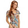 Koszula damska z krótkim rękawkiem - wykonana z miłej w dotyku wiskozy ozdobionej wzorem w kolorowe kwiaty - dekolt w kształcie litery "V" z satynową kokardką Skład: 94% wiskoza, 6% elastan